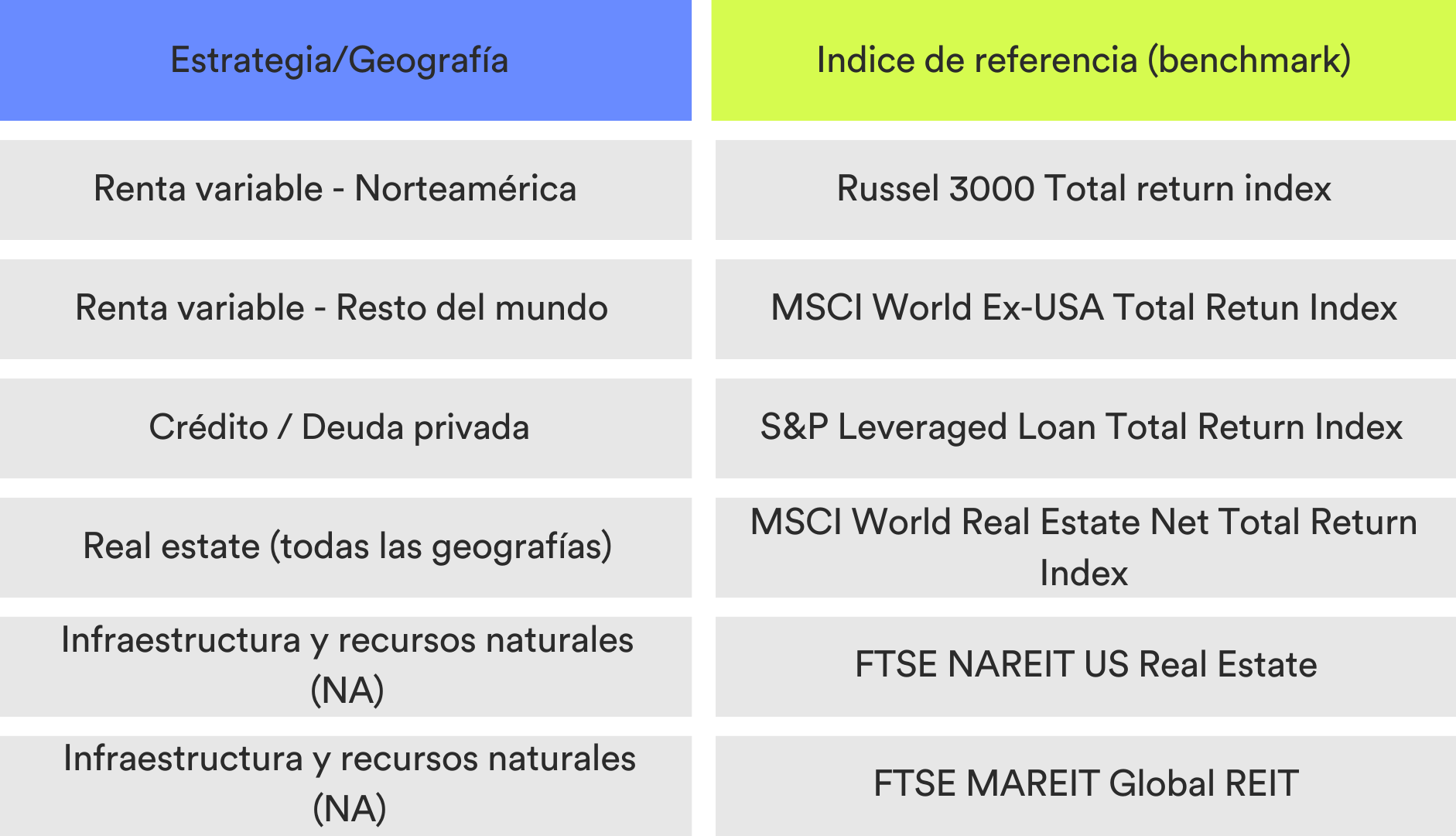 Una decisión crítica en el cálculo del PME es el índice contra el que se compara. Usar un único índice para todas las estrategias distorsionaría los resultados: no tiene sentido comparar un fondo de crédito privado con la evolución de la bolsa americana. Por eso el estudio utiliza benchmarks específicos por estrategia y geografía: